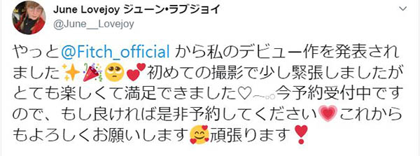 来自美国的June Lovejoy,今年23岁,拥有白皙的F罩杯浑圆巨乳,以及173公分长腿,再加上恰到好处的欧美肉感身材,被肉感美女专门片商「Fitch」相中,预计于2020年1月11日正式专属出道,与大部份参与日本AV片商拍摄,协定短期拍摄一片两片的欧美AV女优不同,June Lovejoy被日本AV经纪事务所
